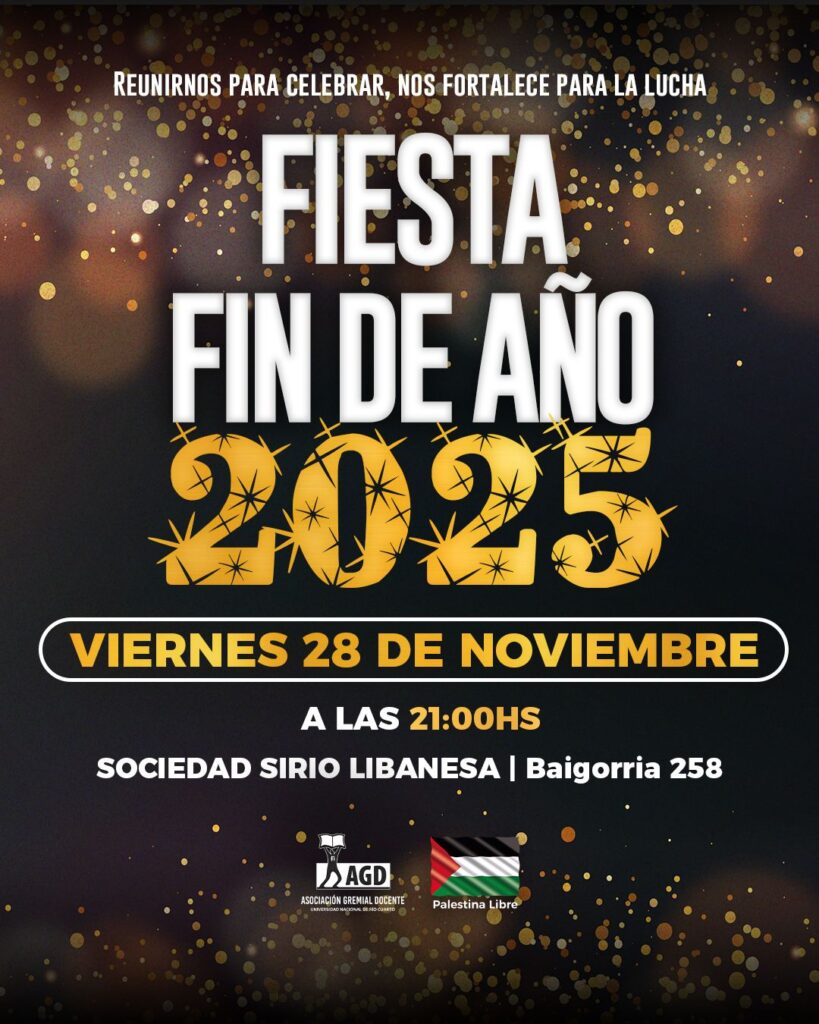 🎉 Estimadxs: ¡Se viene la Fiesta de Fin de Año 2025! 🎉 🗓 Viernes 28 de noviembre – 21:00 hs 📍 Sociedad Sirio Libanesa | Baigorria 258 ✨ A pesar de este año complejo, será una noche para celebrar, compartir,