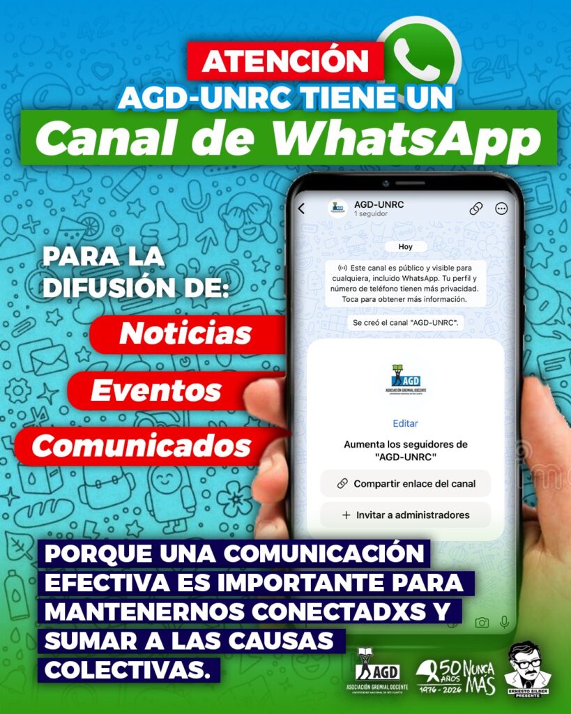 📢 ¡Atención! AGD-UNRC ya tiene su *Canal de WhatsApp* 🟢 Un espacio para mantenernos informadxs y conectadxs 🤝 📰 Noticias 📣 Comunicados 📅...