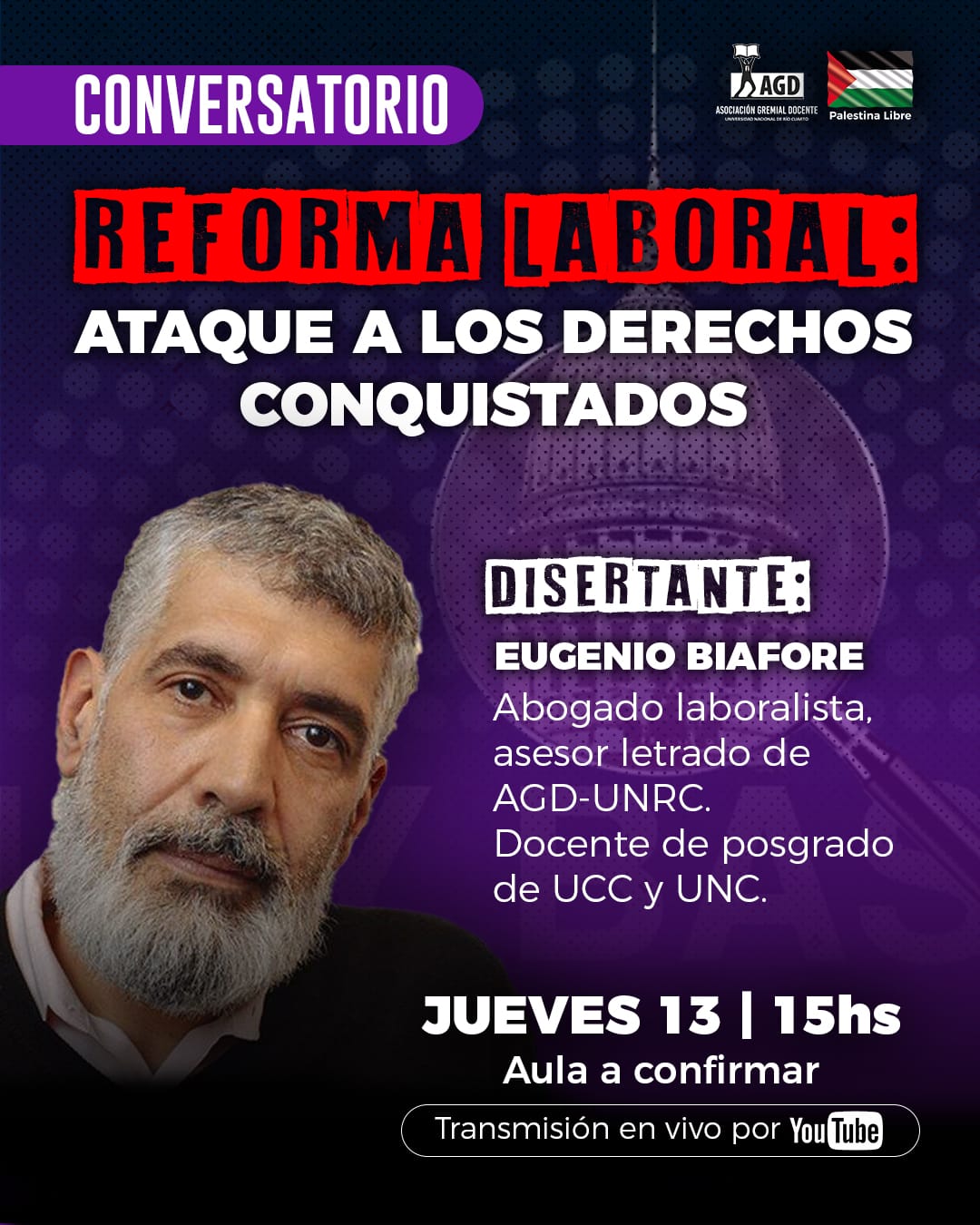 🎤 Disertante: Eugenio Biafore Abogado laboralista, asesor letrado de AGD-UNRC. Docente de posgrado UCC y UNC. Miembro de la Asociación  Argentina de Derecho del Trabajo y la Seguridad Social.  Miembro de la Asociación de Abogados Laboralistas de Córdoba.