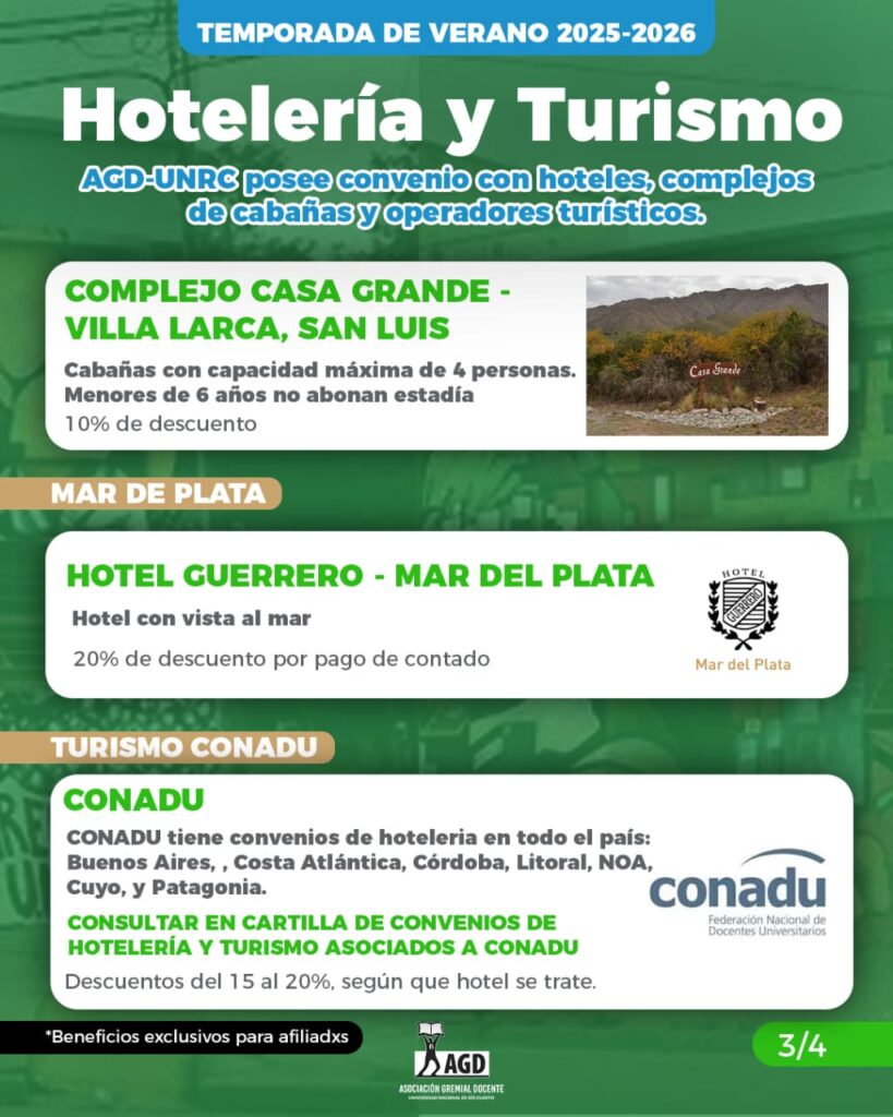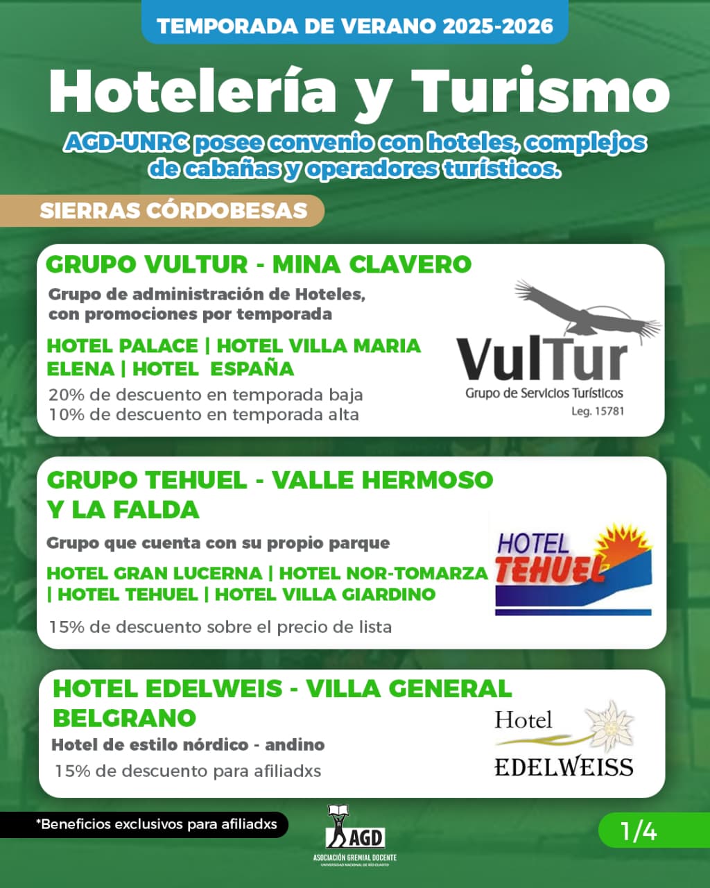 🏨 La Asociación Gremial Docente tiene convenios con hoteles, complejos, cabañas y operadores turísticos con promociones y descuentos especiales para afiliadxs.