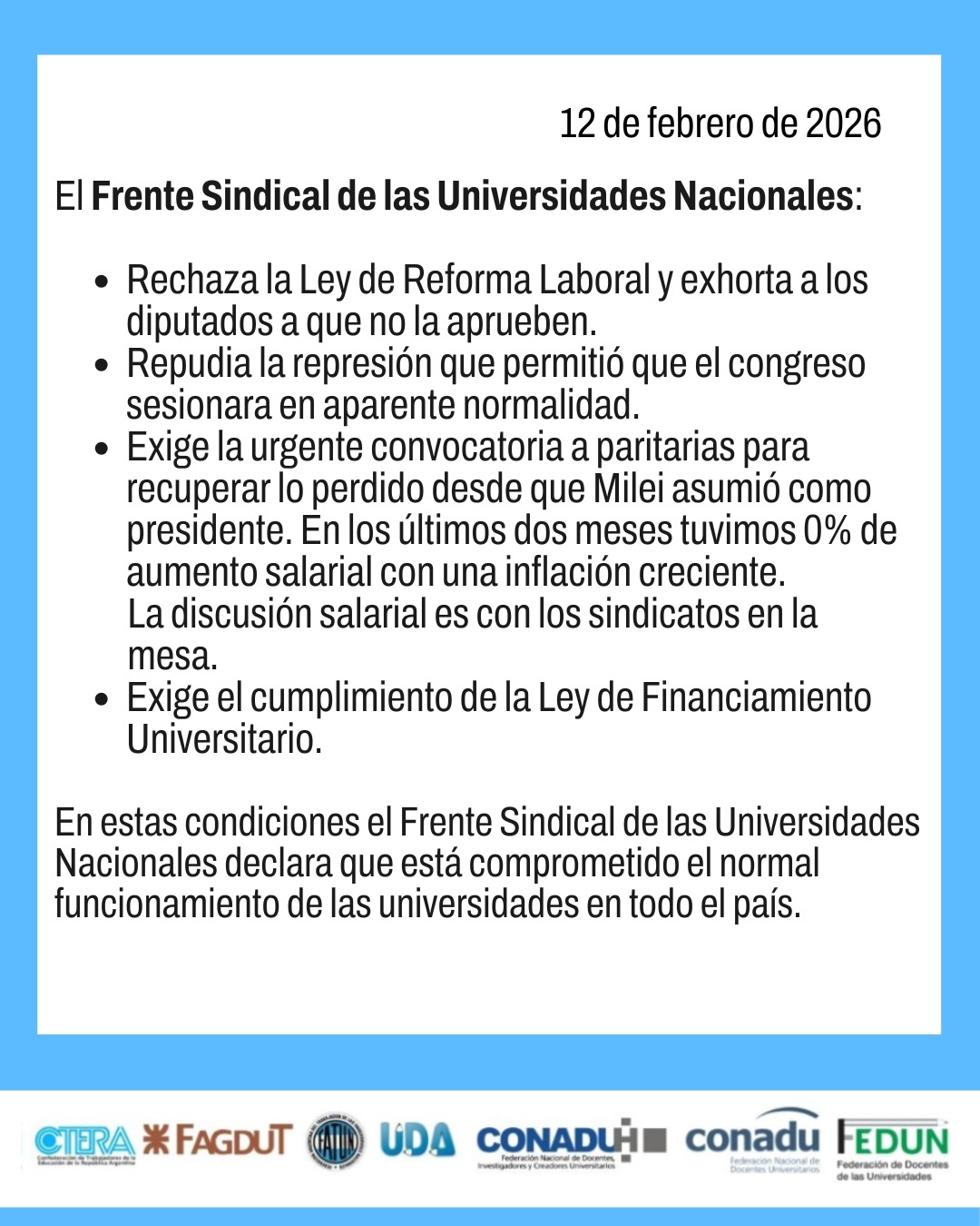 El Frente Sindical de las Universidades Nacionales se reunió hoy en la CONADU para coordinar y construir una posición común de cara al ciclo lectivo que comienza y a la necesidad de implementación urgente de la Ley de Financiamiento Universitario.