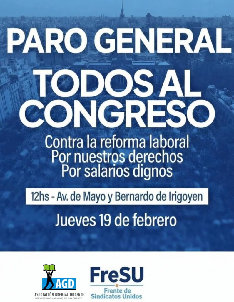 El Frente de Sindicatos Unidos (FreSU) ratifica el Paro Nacional y la movilización al Congreso de la Nación prevista para este jueves 19 de febrero, cuando se realizará una jornada de lucha en todo el país en coincidencia con el tratamiento del proyecto de reforma laboral en la Cámara de Diputados.