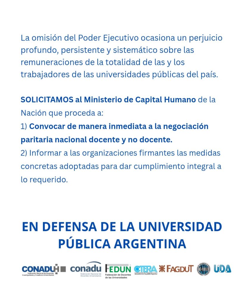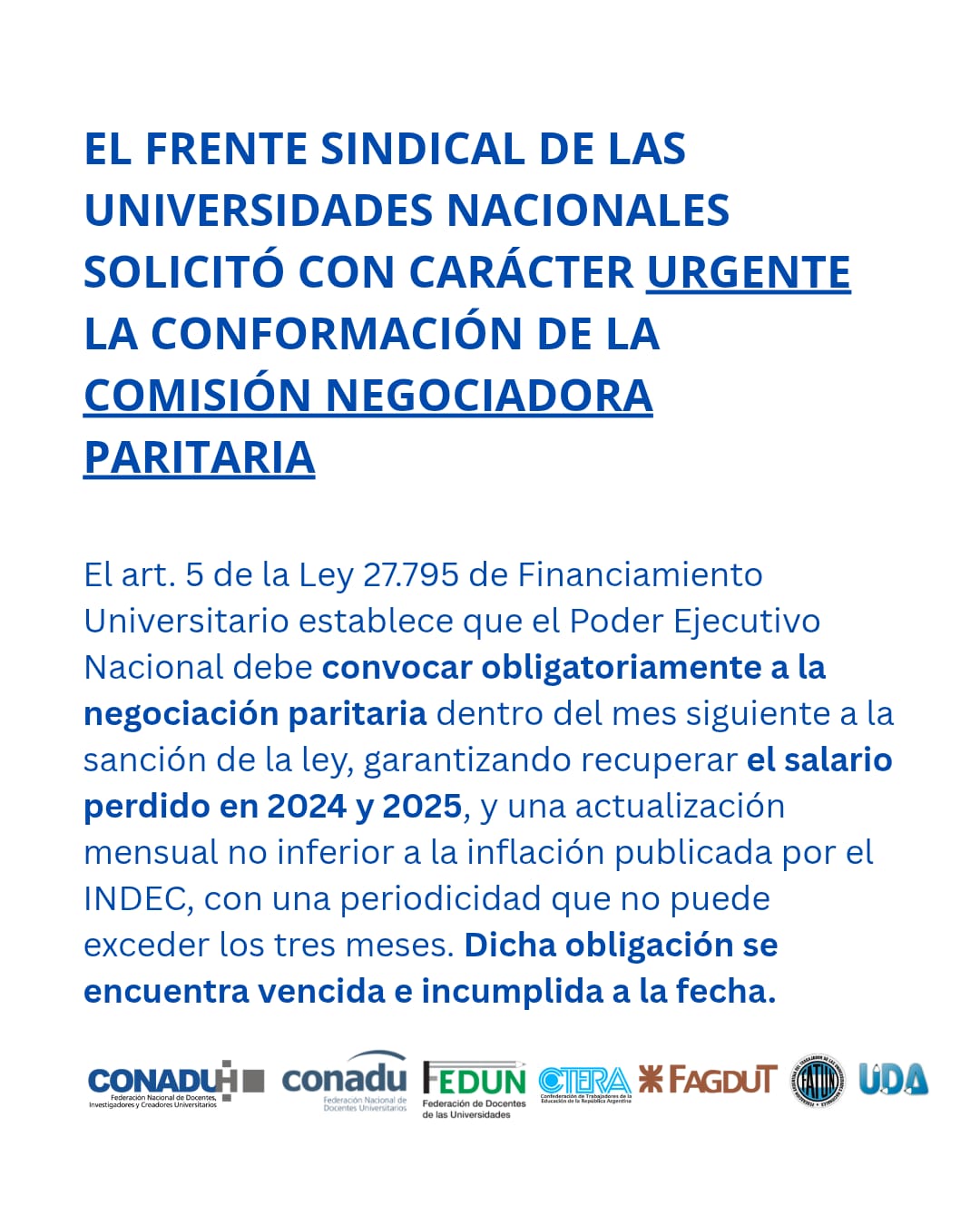 El Frente Sindical de las Universidades Nacionales presentó al Ministerio de Capital Humano un requerimiento formal para solicitar la conformación urgente de la Comisión Negociadora Paritaria.
