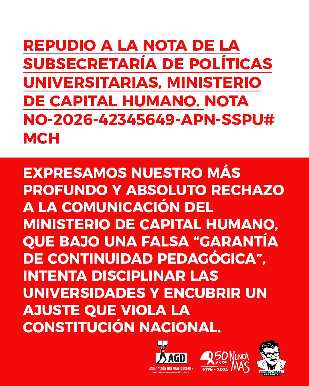 Repudio a la nota de la Subsecretaría de Políticas Universitarias, Ministerio de Capital Humano. Nota NO-2026-42345649-APN-SSPU#MCH.