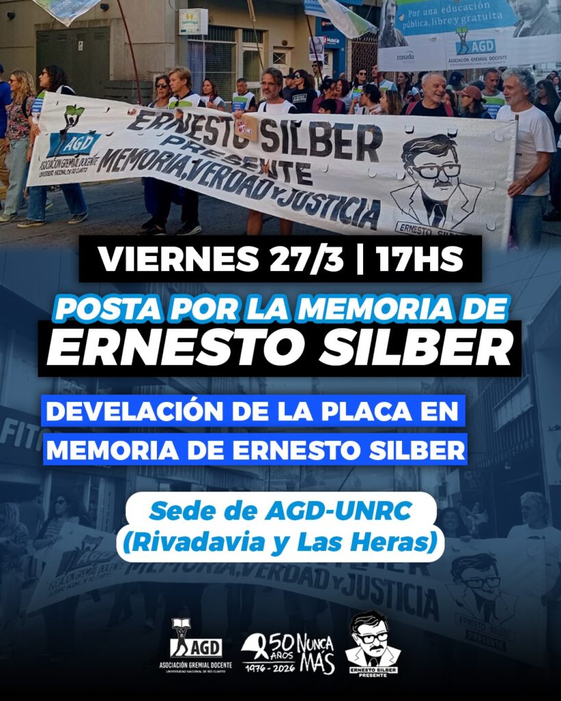 Posta por la memoria de Ernesto Silber Desde AGD-UNRC invitamos a la comunidad a la develación de una placa conmemorativa por la memoria de Ernesto Silber , docente de la Universidad Nacional de Río Cuarto, detenido en 1976 durante la última dictadura cívico-militar y eclesiástica, y posteriormente asesinado bajo tortura . Nos encontraremos, para esta […]