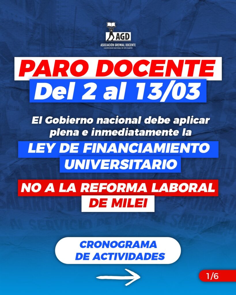La Asamblea Docente de AGD-UNRC resolvió por unanimidad, un Paro total sin asistencia a los lugares de trabajo, del 2 al 13 de marzo en reclamo por el cumplimiento efectivo de la Ley de Financiamiento Universitario. Durante este período, el cese de actividades será total e involucrará suspensión de actividades académico- administrativas: no toma de […]