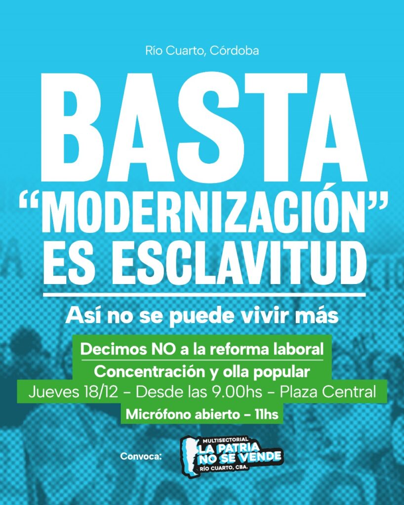 🔴 Lxs trabajadorxs docentes de las universidades públicas nos manifestamos el jueves 18 contra una reforma laboral que no resuelve ningún problema del mundo del trabajo, que no moderniza,no crea empleo y solo apuesta al disciplinamiento de la clase trabajadora. 📅 18/12 AGD-UNRC integrante de la Multisectorial La Patria No se Vende adhiere y convoca […]