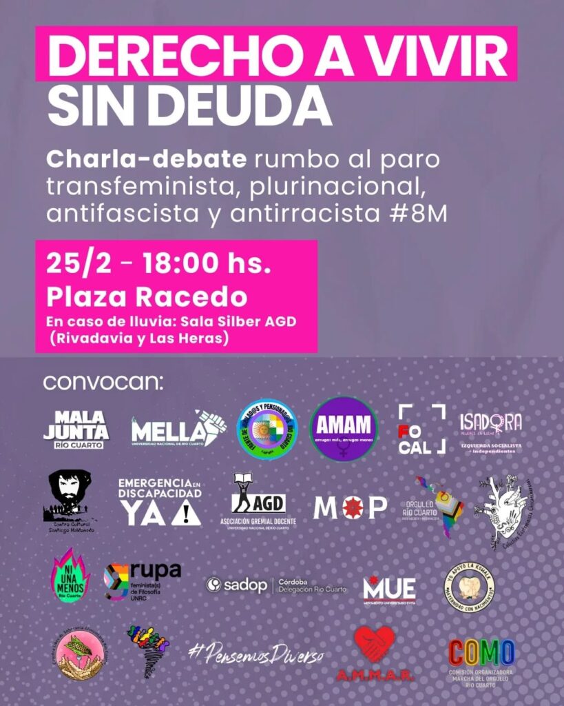 Derecho a Vivir sin Deuda. Charla- debate rumbo al paro transfeminista, plurinacional, antifacista y antirracista. # 8 M 🗓 Miércoles 25/02 🕕 18:00 horas 📍 Plaza Racedo ❗️En caso de lluvia, se traslada a sala Ernesto Silber, en AGD-UNRC ( Rivadavia y Las Heras). 💪🏻 Sumate a esta jornada de encuentro colectivo. Nos preparamos para […]