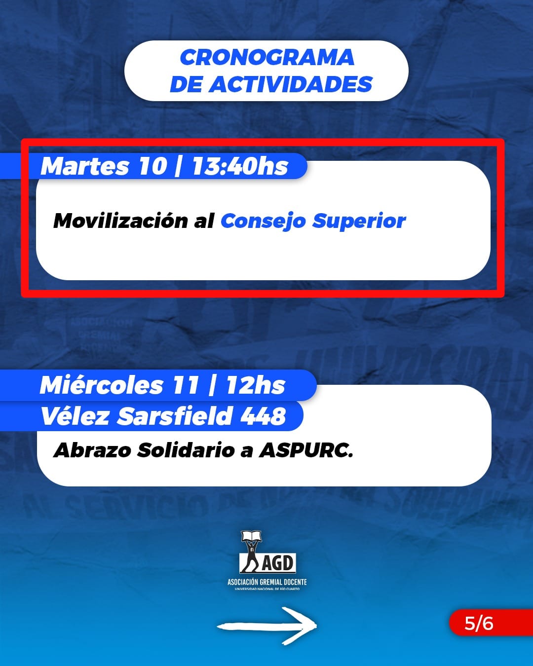 PARO SIN ASISTENCIA A LOS LUGARES DE TRABAJO DEL 02 AL 13/03 Cronograma de actividades actualizado 📅 👉🏽 Martes 10 – 13:40 hs Movilización al Consejo Superior. 👉🏽 Miércoles 11 – 12 hs Abrazo Solidario a ASPURC. Velez Sarsfield 448