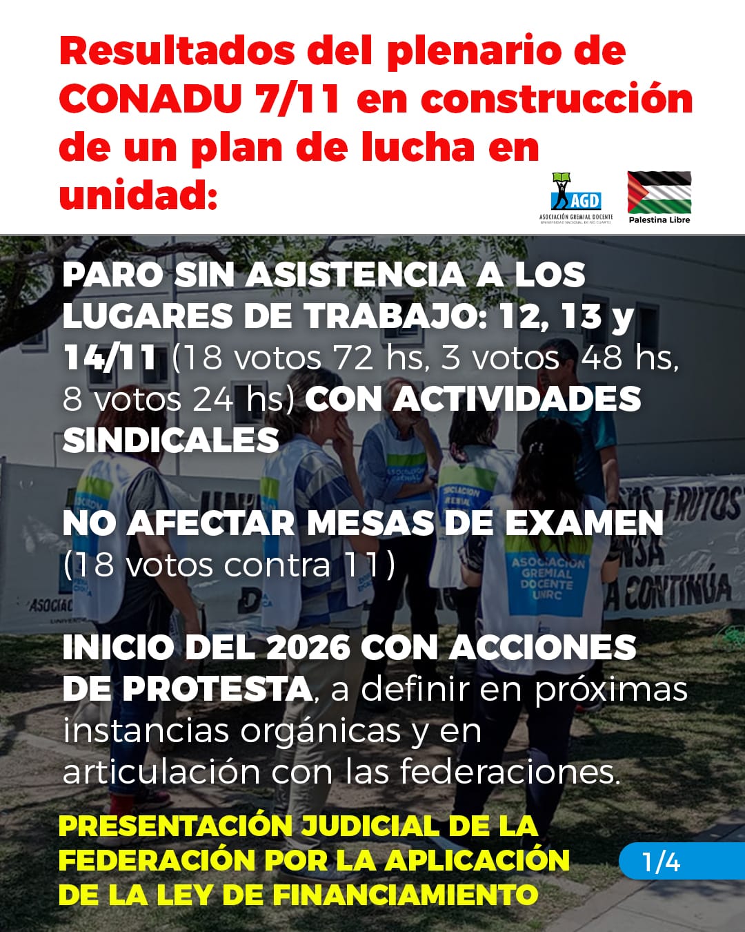 Este 7 de noviembre se reunió el Plenario General de CONADU para construir en unidad el Plan de Lucha en base al relevamiento realizado a docentes universitarios y preuniversitarios de las UUNN. AGD llevó a este plenario los resultados obtenidos