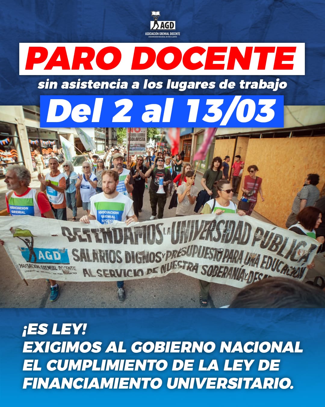 La Asamblea Docente de AGD-UNRC resolvió por unanimidad, un Paro total sin asistencia a los lugares de trabajo, del 2 al 13 de marzo en reclamo por el cumplimiento efectivo de la Ley de Financiamiento Universitario. Durante este período, el